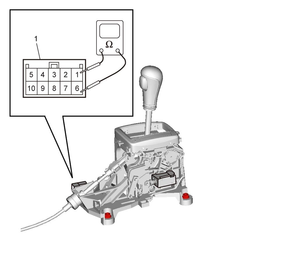 3) Check for continuity between terminals "1" and "6" of select lever connector (1). If check result is not as specified, replace select lever assembly.