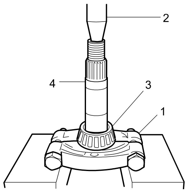 7) Remove front taper roller bearing (3) from bevel pinion (4) by using bearing puller (1) and hydraulic press (2).