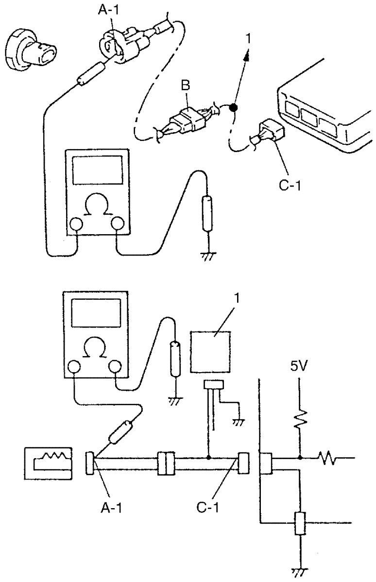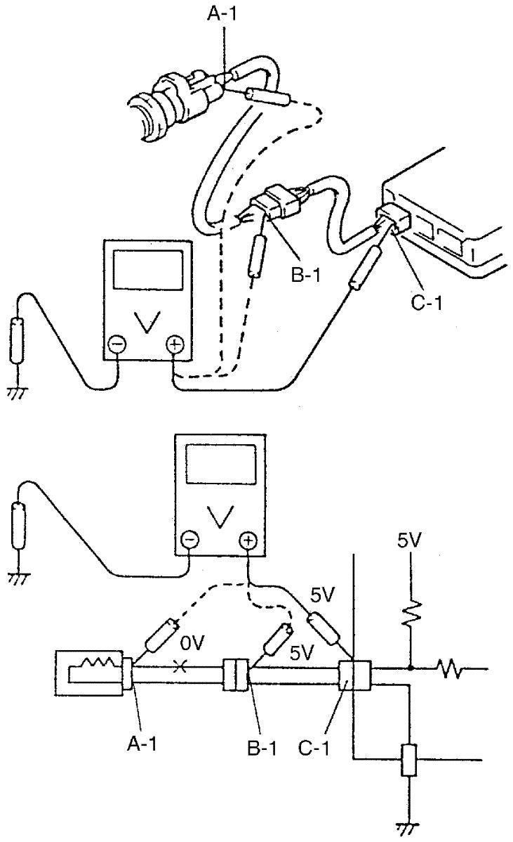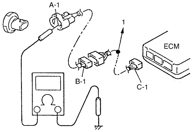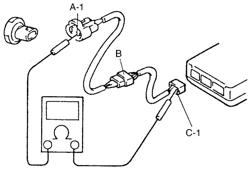 If no continuity is indicated, that means that the circuit is open between terminals "A-1" and "B-1". If continuity is indicated, there is an open circuit between terminals "B-1" and "C-1" or connector-B is defective.