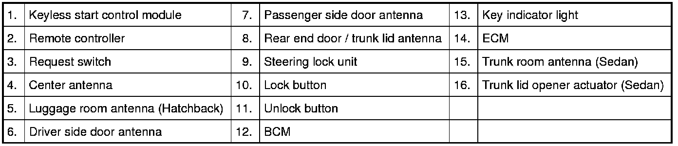 Keyless start system consisting of the parts shown below has four functions as described below.