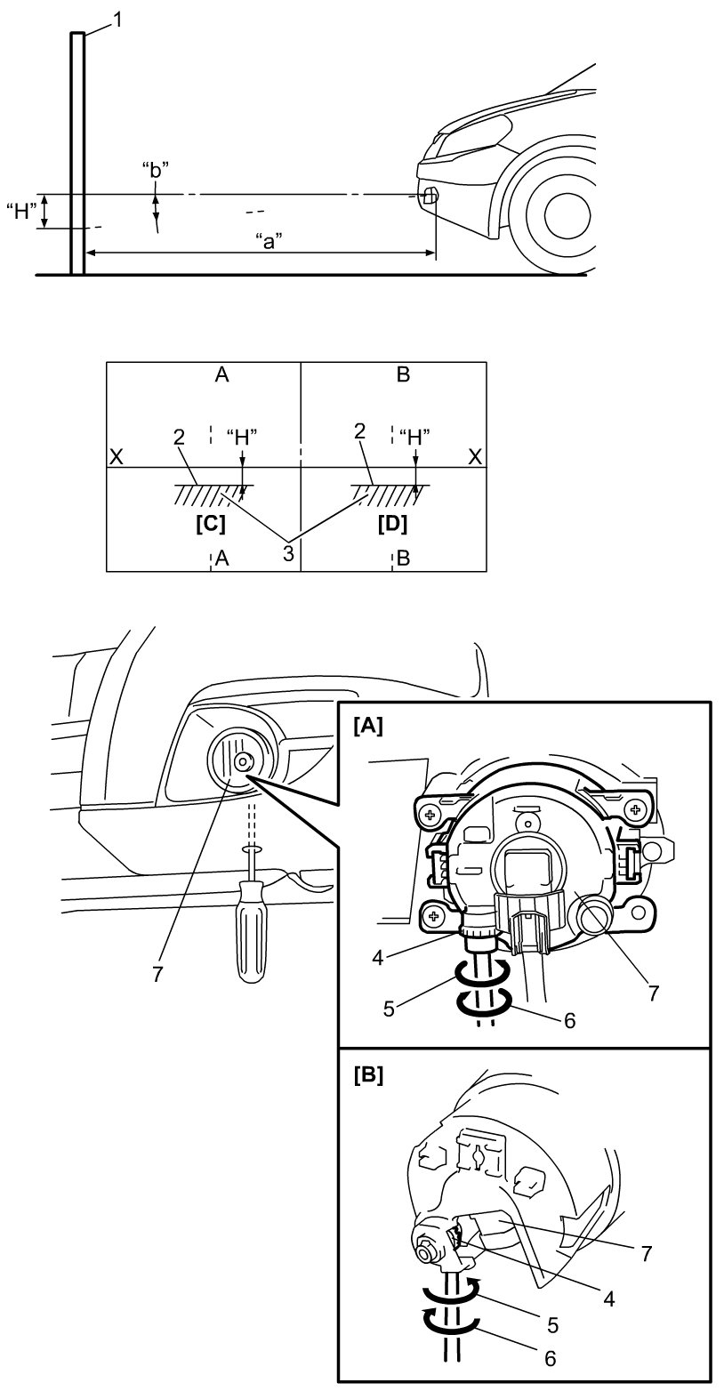 - Unless otherwise obligated by local regulations, adjust front fog light aiming according to the following procedure.