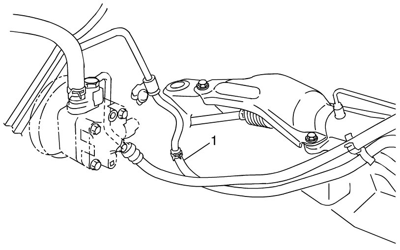 3) When engine is cool, remove P/S gear low pressure hose (1) from pipe and drain P/S fluid from low pressure hose.