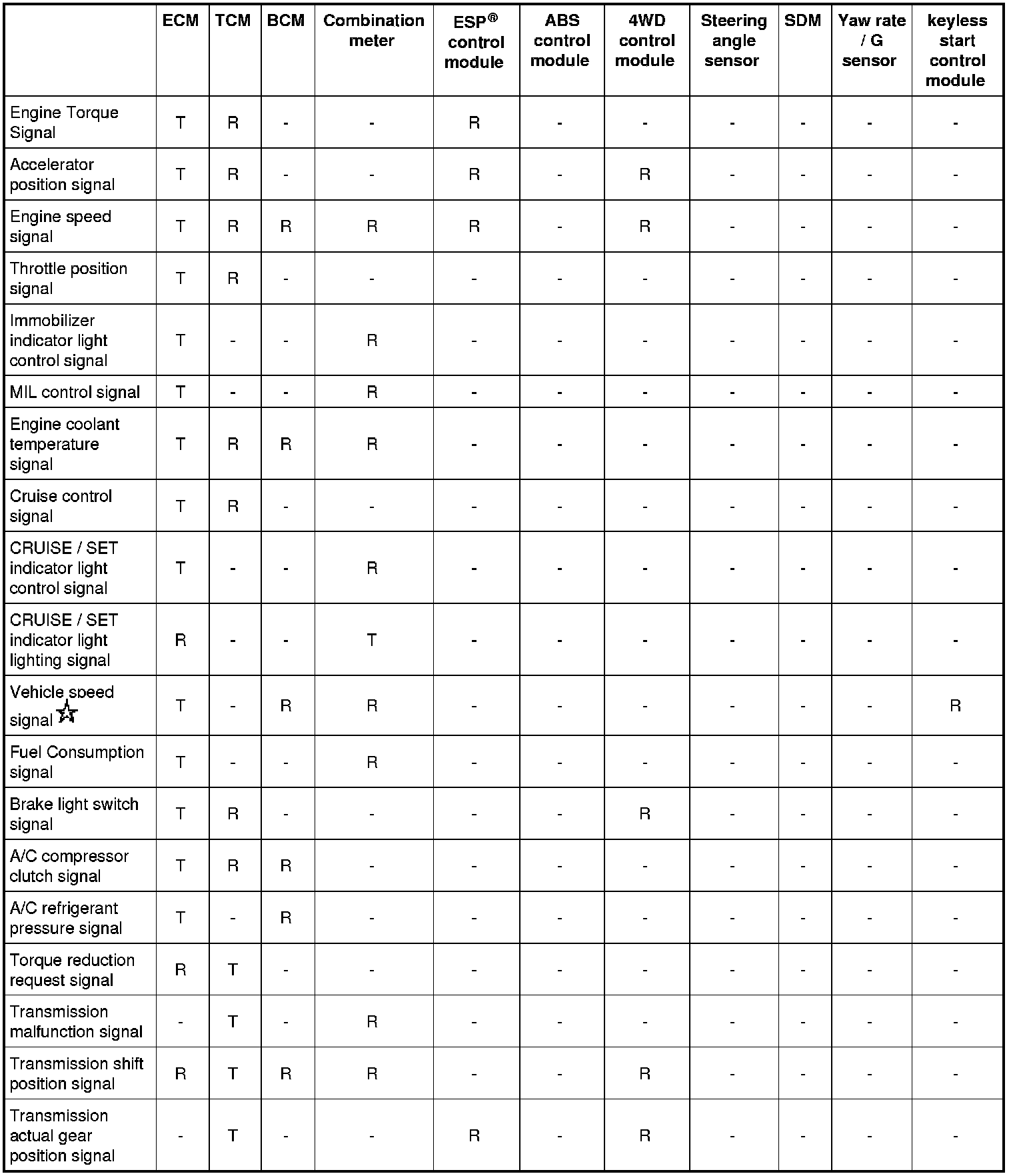- : ECM, using wheel speed signal transmitted from ABS / ESP(R) control module, calculates and determines vehicle speed and transmit that information to each control module.