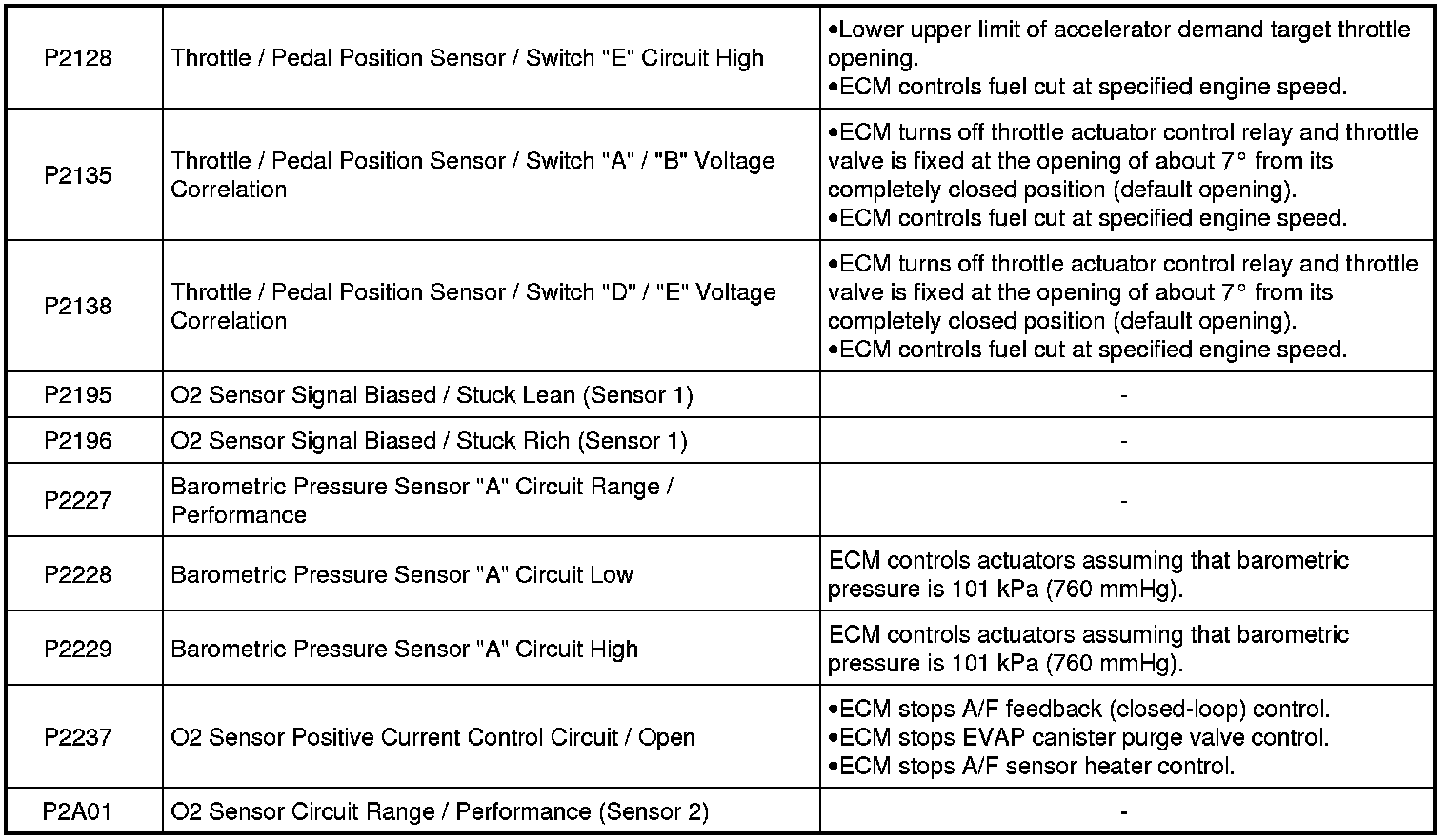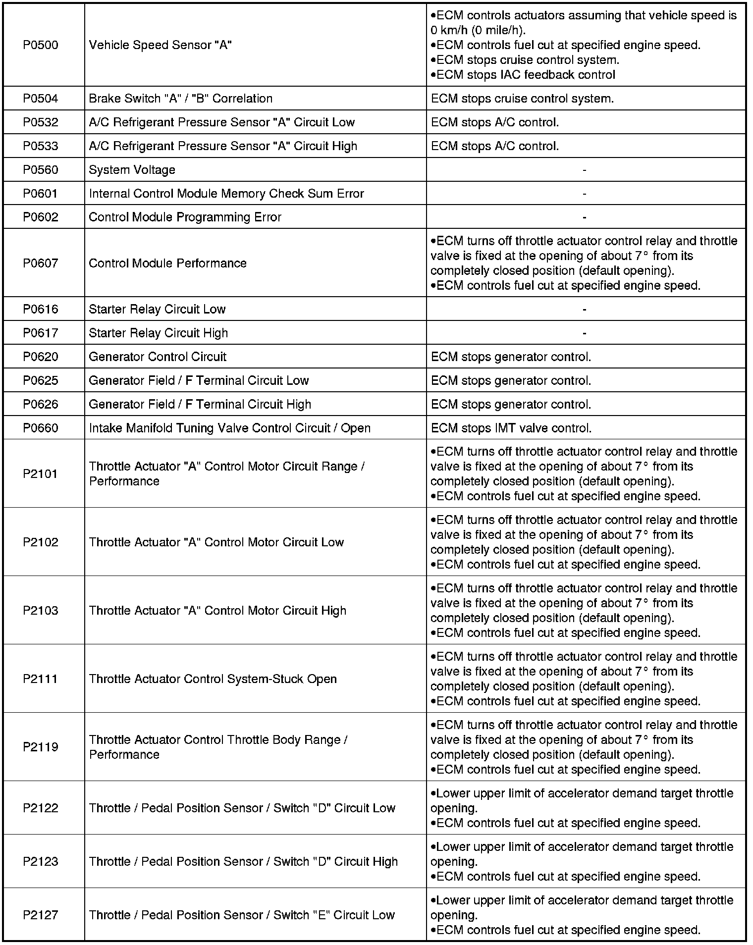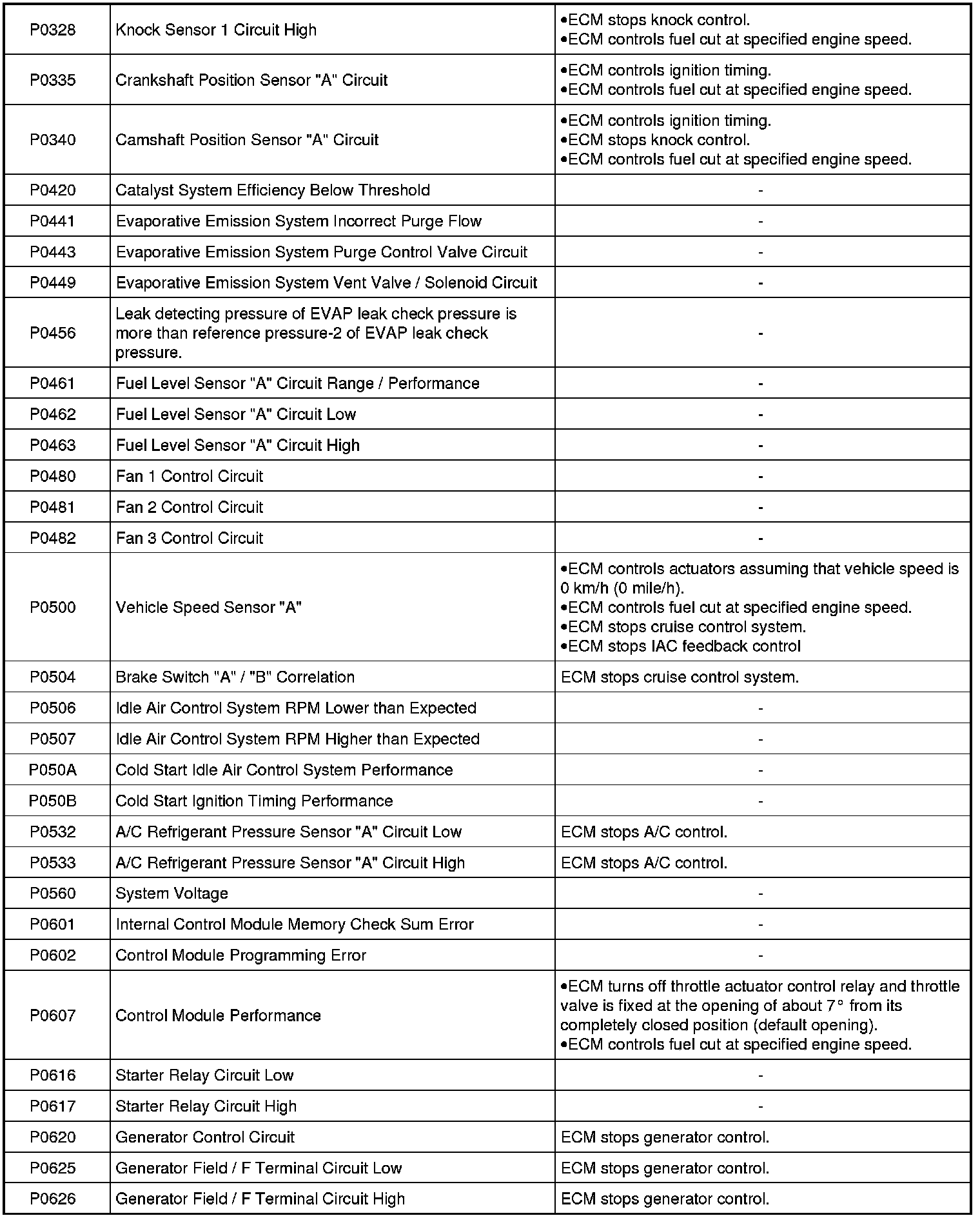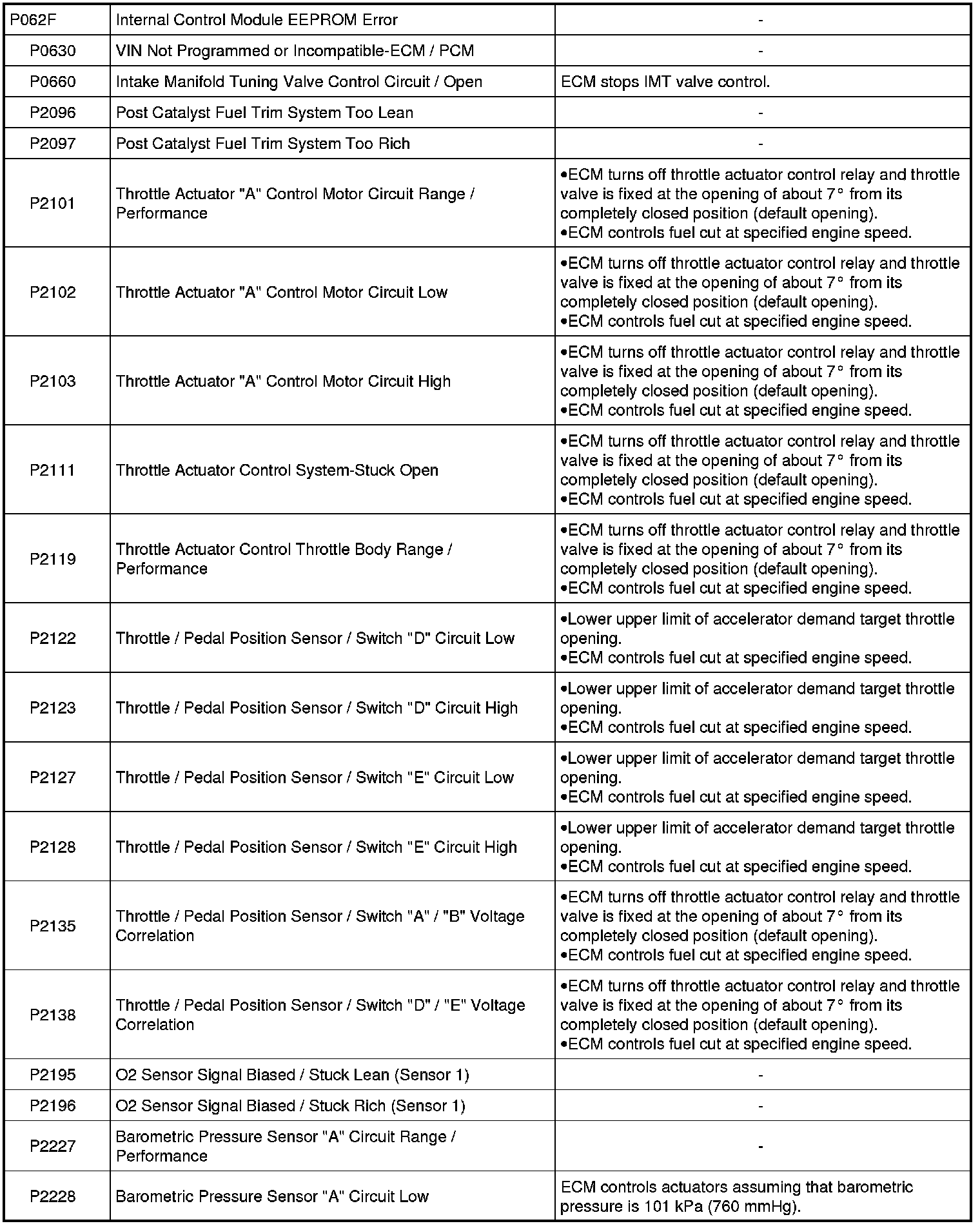 When any of the following DTCs is detected, ECM enters fail-safe mode as long as malfunction continues to exist but that mode is canceled when ECM detects normal condition.