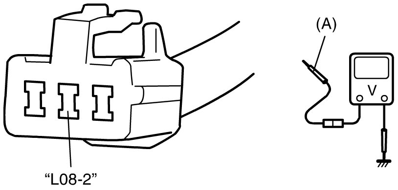 With ignition switch turned ON, measure voltage between "L08-2" terminal and body ground.