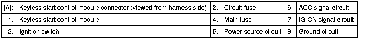 Check for proper connection to "Power source", "ACC signal" and "IG ON signal" terminal of keyless start control module connector.