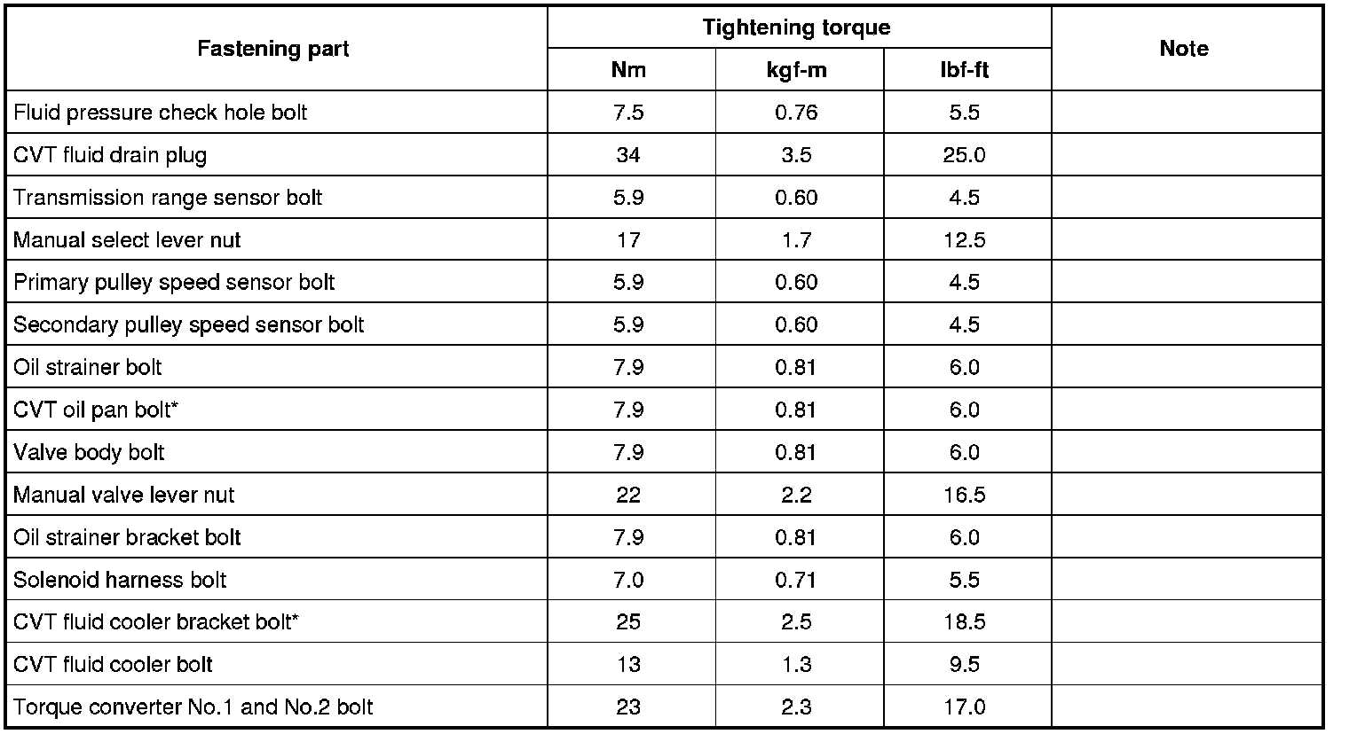 Tightening Torque Specifications