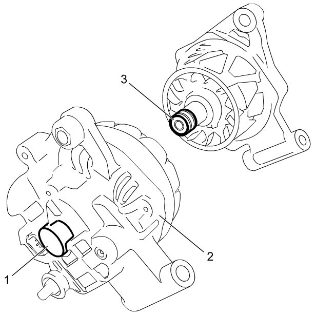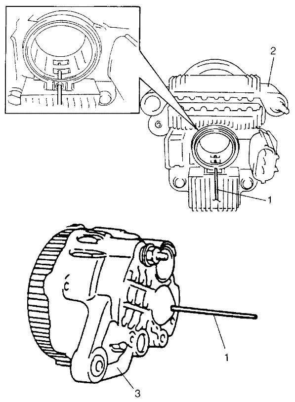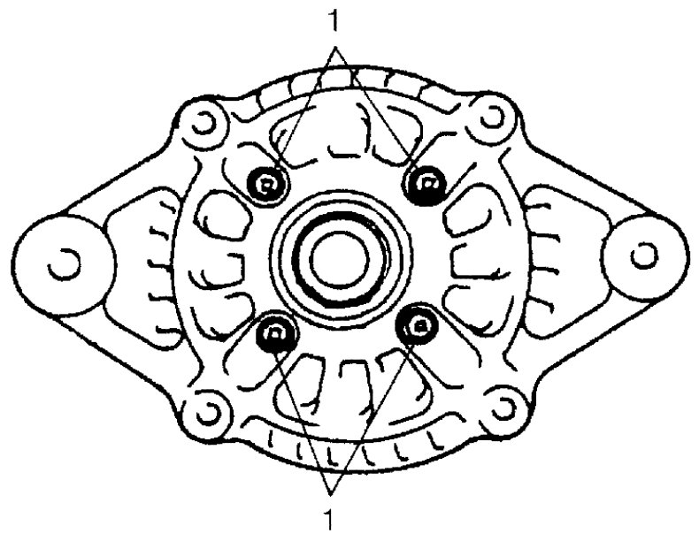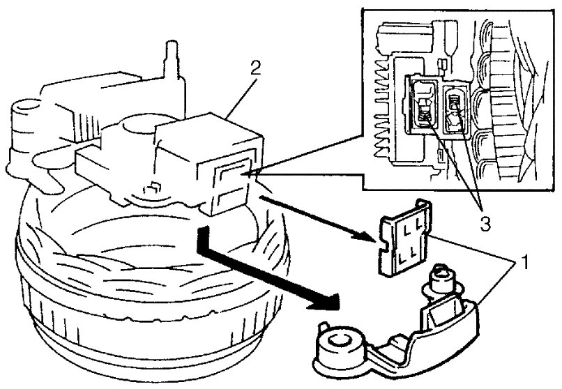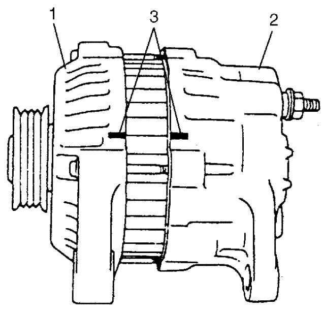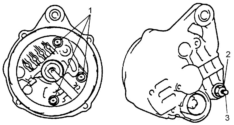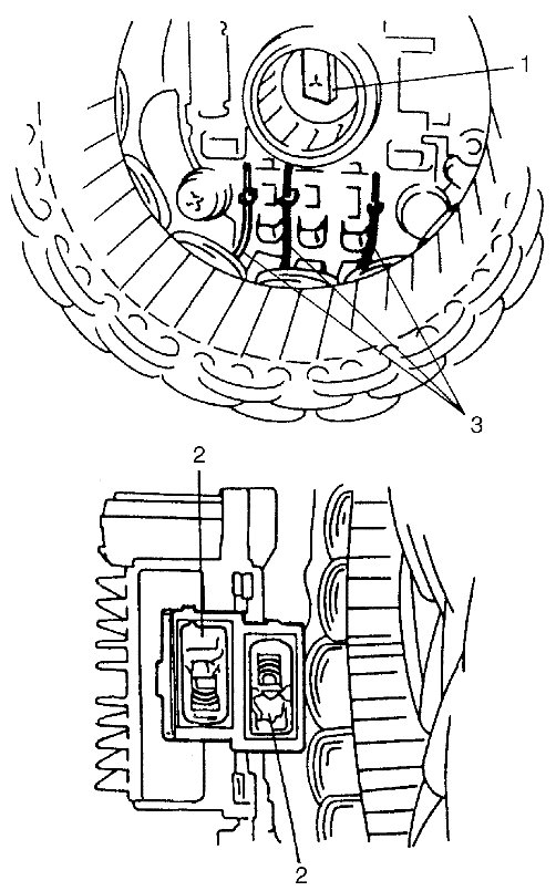 - Push brushes into brush holder, then support brushes by inserting appropriate wire (1) before installing IC regulator assembly (2) to rear end frame (3).