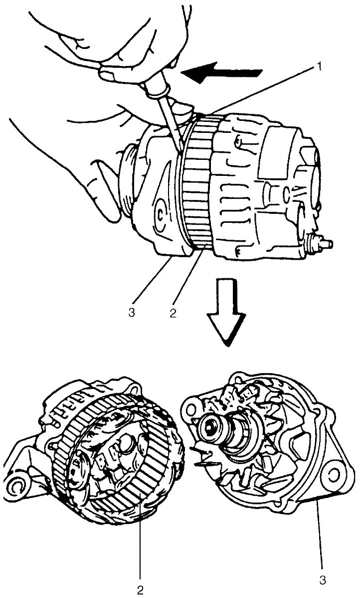 3) With lever (1) inserted between stator core (2) and drive end frame (3), separate generator into drive end frame (3) and rear side.