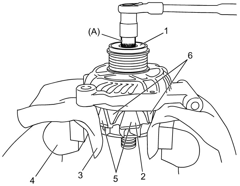 The rotor may be damaged if it is not held in a vise in the specified method and at the indicated parts when loosening the pulley nut.