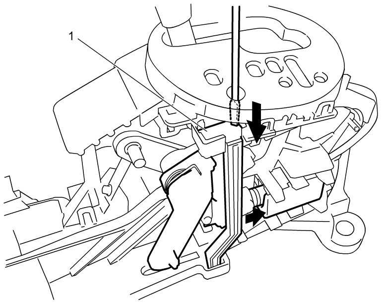 Remove plug cap of select lever and push down shift lock solenoid release plate (1) inside of plug hole with a flat-head screwdriver or the like. Then, select lever can be moved from "P" range position to another range even without depressing the brake pedal. (To shift select lever from "P" range to any other position, turn ignition switch to "ACC" or "ON" position.)