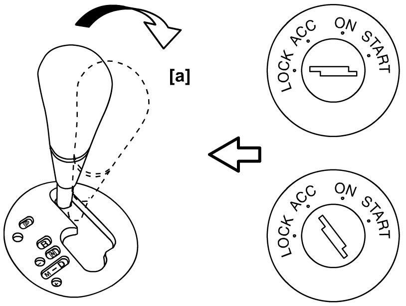 1) Check that select lever cannot be moved to any other range from "P" range position when ignition key is at "ACC" position, at "LOCK" position or it is removed from keyhole of ignition switch, or brake pedal is not depressed.