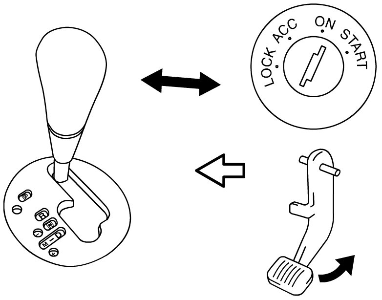 - When ignition switch is turned "ON" position and brake pedal is depressed, select lever can be shifted from "P" range position to any other range.