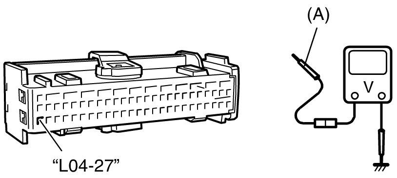 With ignition switch turned ON, measure voltage between "L04-27" terminal of SDM connector and body ground.