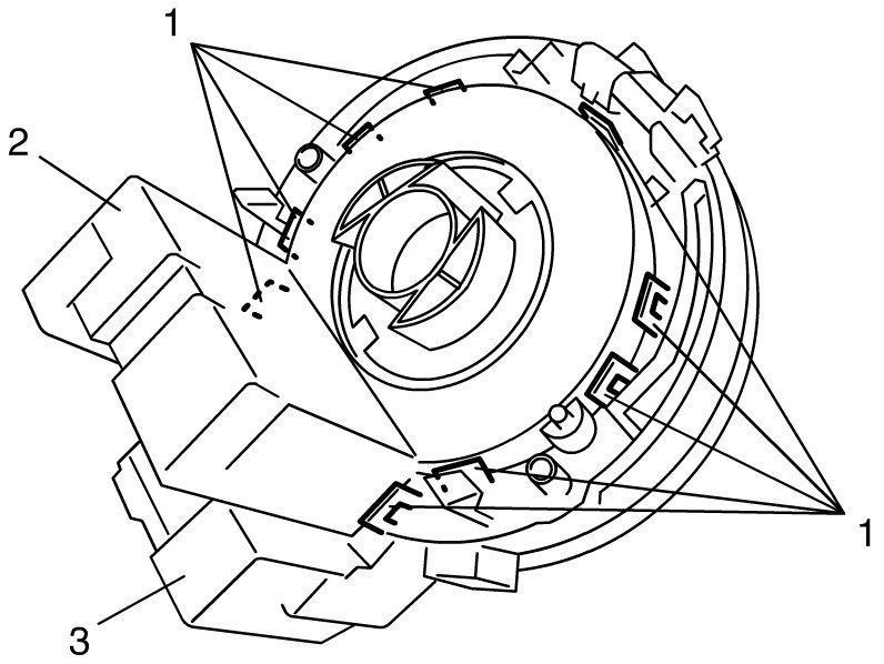 2) Remove steering angle sensor (2) from contact coil cable assembly (3) while opening fitting parts (1) of contact coil cable assembly.