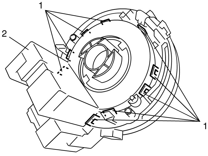 1) Install steering angle sensor (2) by fitting engagement parts (1) of contact coil cable assembly to claws of steering angle sensor as shown in figure.