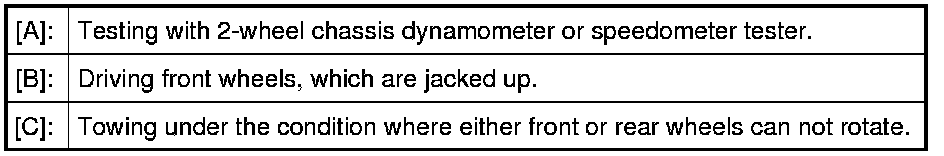 - Never perform service work with the vehicle in any of the conditions [A], [B] or [C] shown below. If the 4WD-auto or 4WD-lock mode is selected, the vehicle will move since the front wheels drive the rear wheels or the rear wheels drive the front wheels. If the 2WD mode is selected, the coupling in the drive-train will be damaged since there will be a difference in speed between the front and rear wheels.