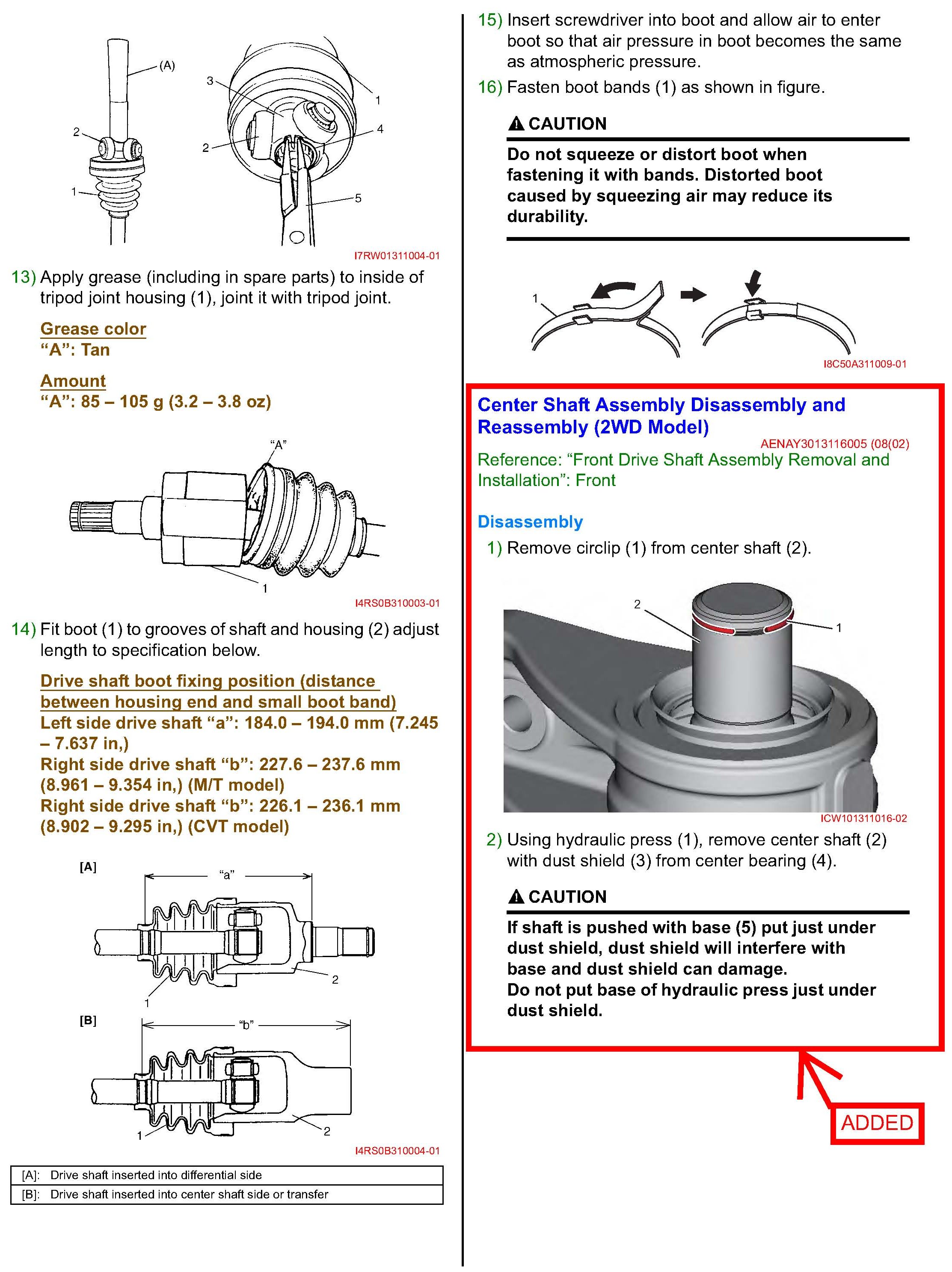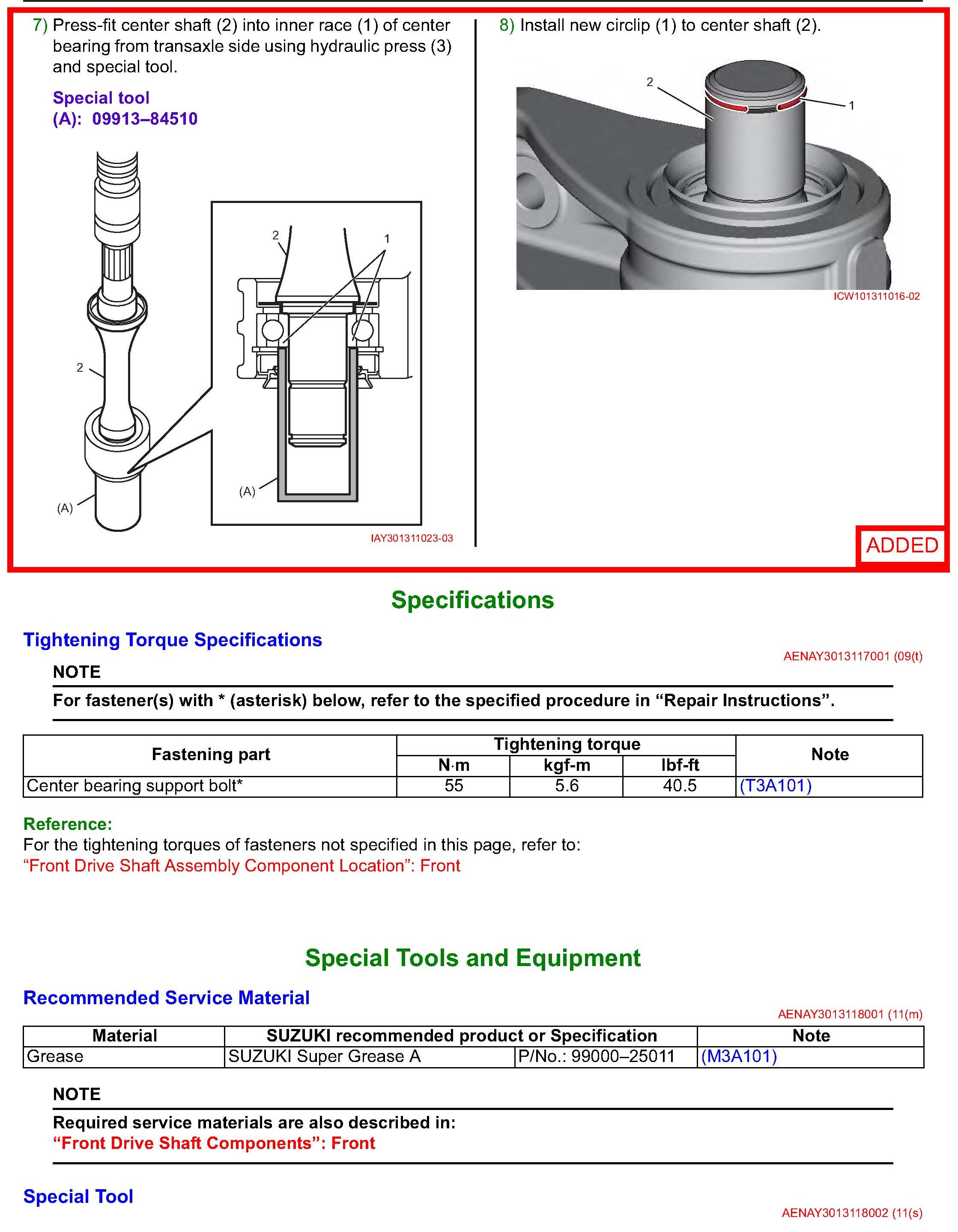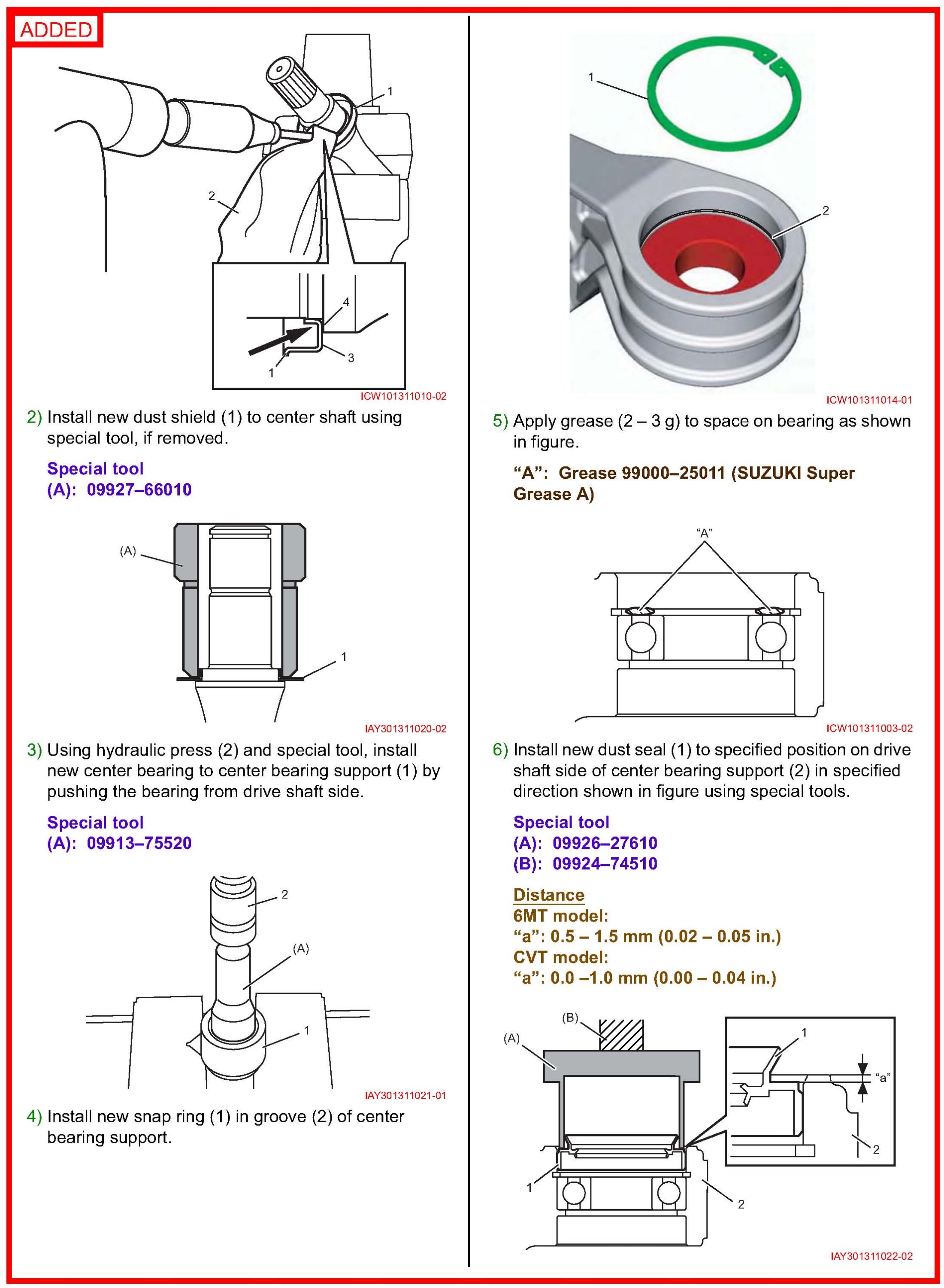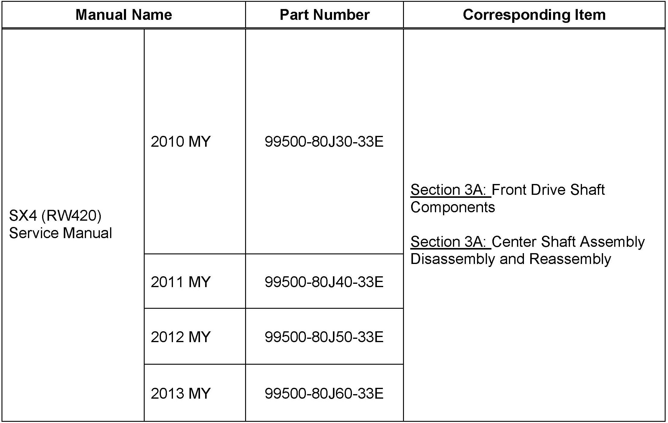 This bulletin is being provided to inform you of service manual additions for Drive Center Shaft Disassembly and Reassembly Procedures for drive center shafts equipped with deflector. Additions apply to 2010~2013 SX4 (RW420) Service Manuals, Section 3A for Front Drive Shaft Components and Center Shaft Assembly Disassembly and reassembly.