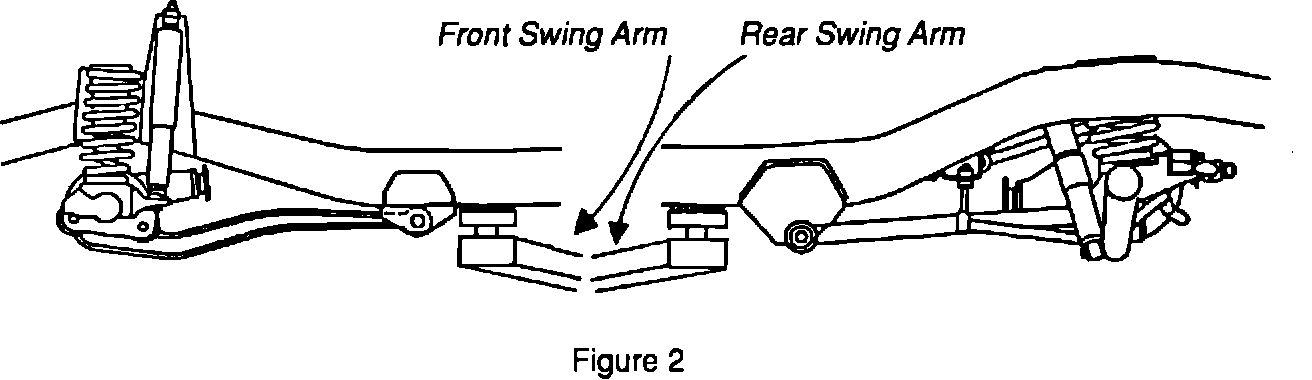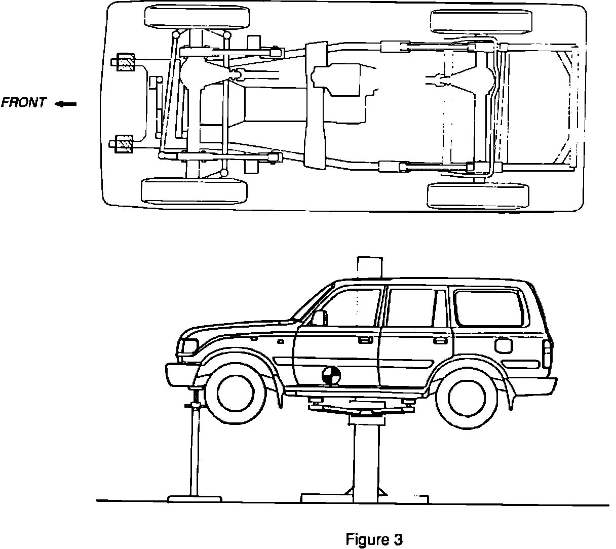 This vehicle, when hoisted on swing-arm type auto-lift may become unstable and cause hazardous conditions when service is performed. The center of gravity for the vehicle may be close to the position supported by the front swing-arms as shown in Figure 1.