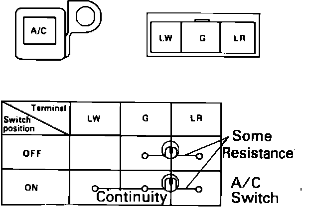 2. Using an ohmmeter, check continuity between specified switch position, Fig. 13 and A/C switch terminals.