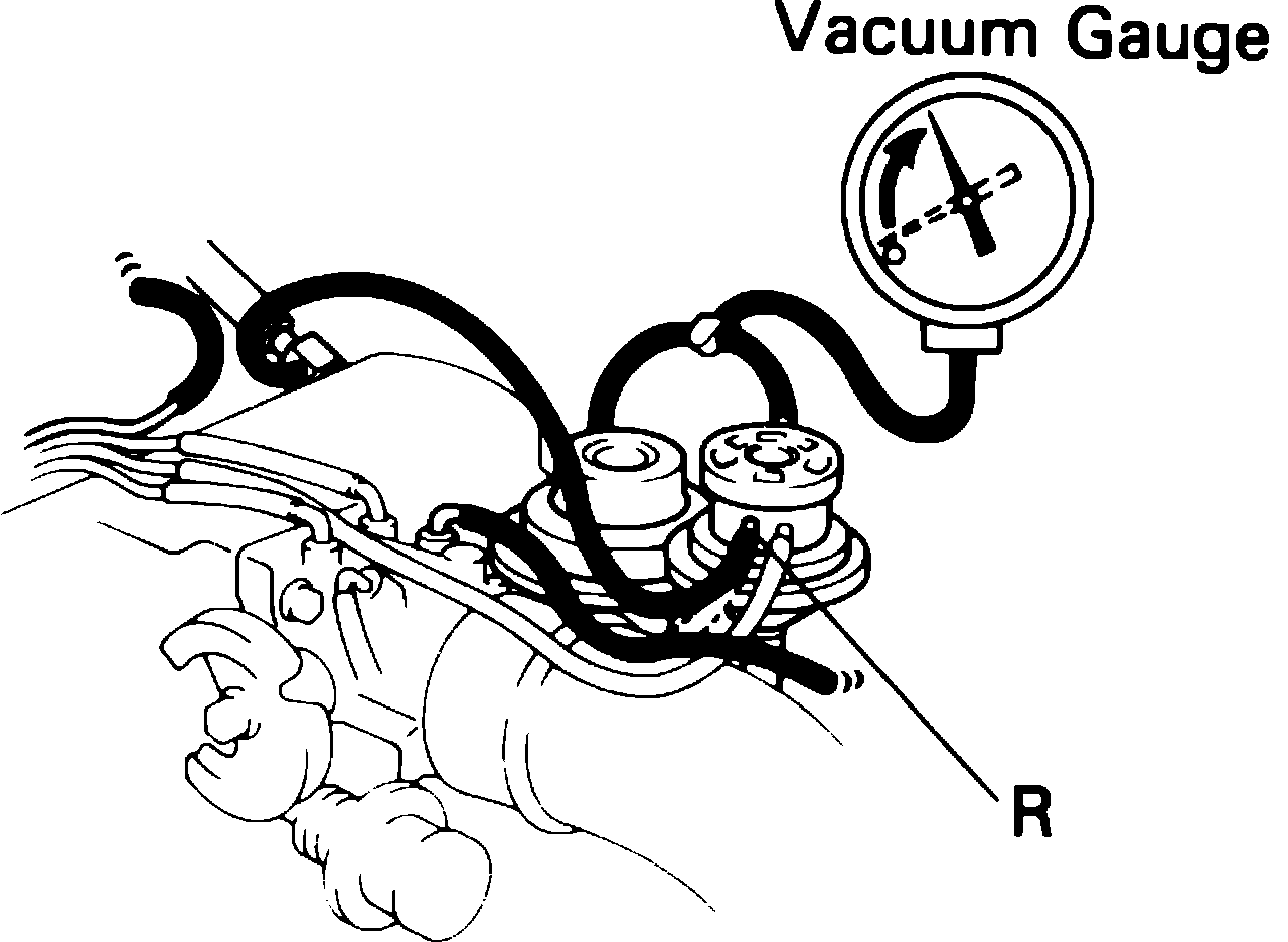 6. Disconnect vacuum hose from port ``R'' of vacuum modulator and connect manifold vacuum directly to port ``R''. Vacuum gauge should indicate high vacuum at 3500 RPM.