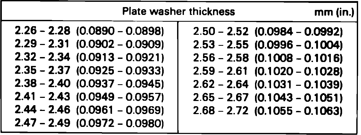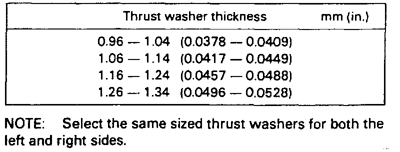 1. Select suitable thrust washers from chart, See Thrust Washer Thickness Table, that will bring backlash to .0020-.0079 inch, then install thrust washers into differential case.