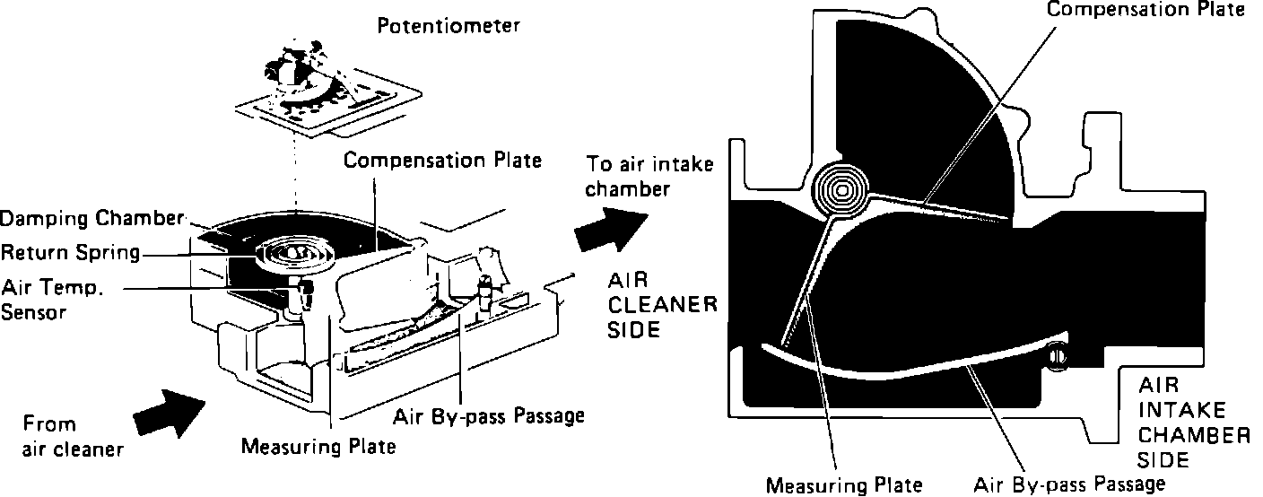 A Bosch vane type airflow meter is mounted in the air induction system near the air cleaner. The airflow meter measures intake air volume, and converts these readings into voltage signals by means of a variable resistor (potentiometer). These voltage signals are then sent to the ECU and used to determine injection duration and proper fuel delivery. When intake air volume is low, the voltage is high; when the intake air volume is high, the voltage signal is approximately zero.