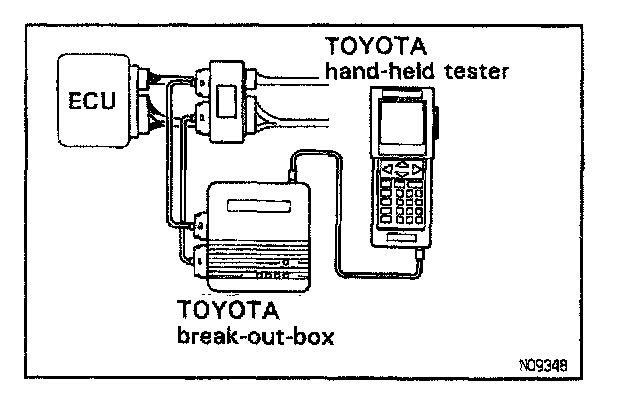 1. Hook up the TOYOTA break-out-box and TOYOTA hand-held tester to the vehicle.