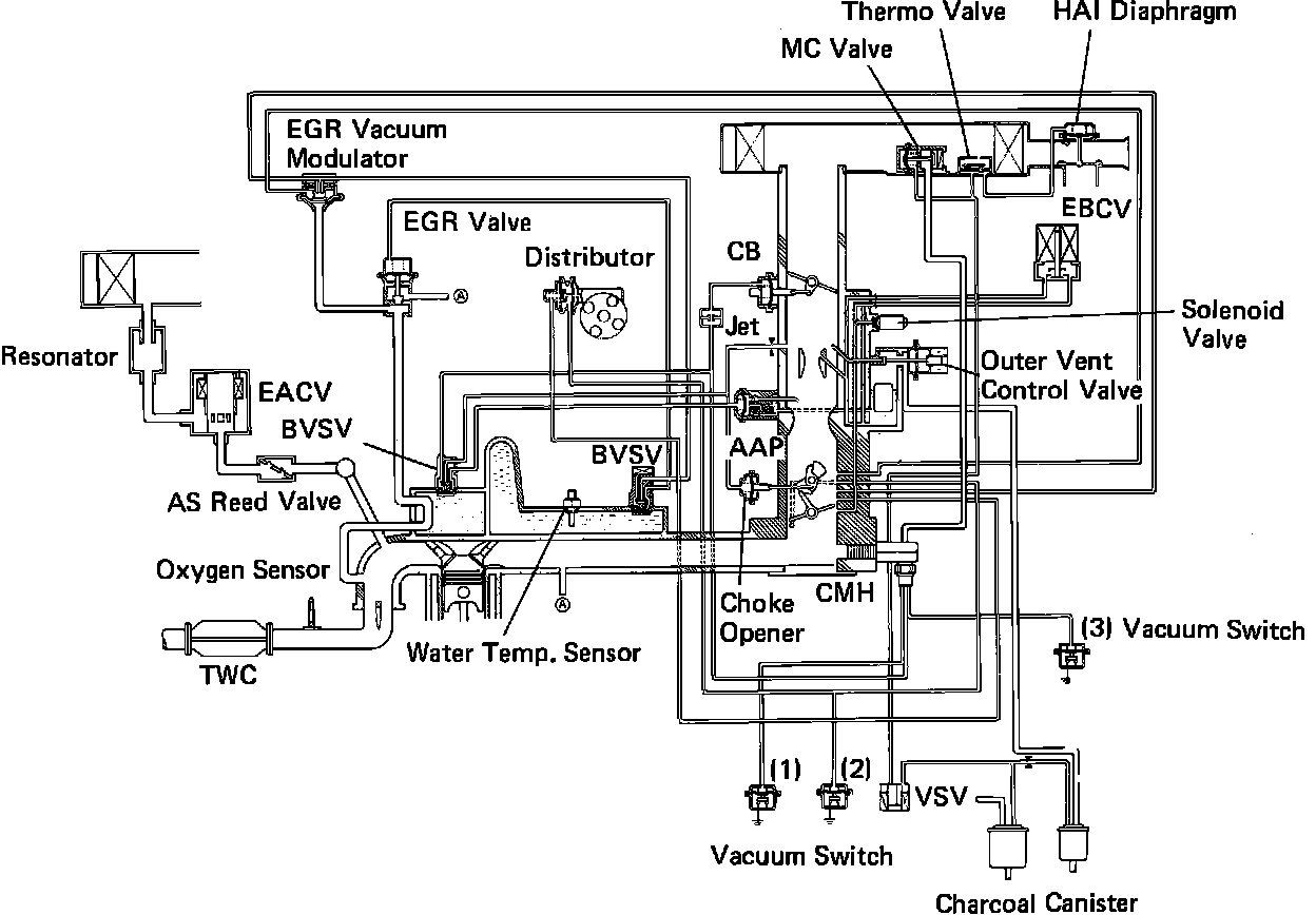 The distributor has 2 vacuum advance diaphragms. The sub-diaphragm is used to improve fuel economy at idle. During cruise conditions, the sub-diaphragm does not operate. Vacuum switch #2, located in the sub-diaphragm vacuum line, does not influence diaphragm operation. It senses and relays vacuum information to the ECU, which utilizes that input to shut off the fuel cut solenoid during deceleration, or periods when engine vacuum is below 14.5 in Hg.