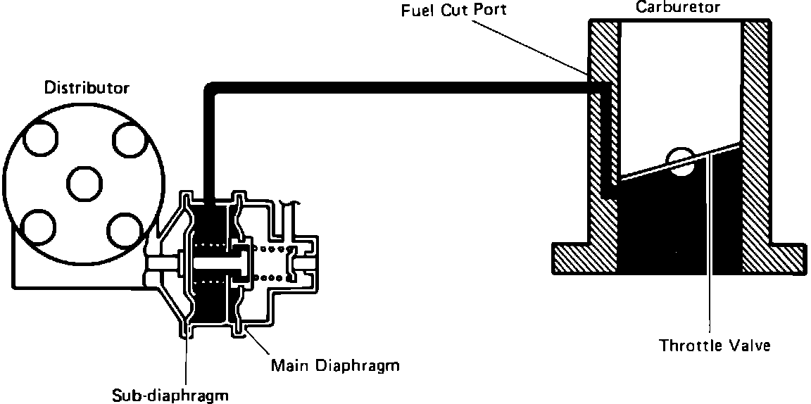 The sub-diaphragm receives a vacuum signal from the fuel cut port. The main diaphragm receives its vacuum signal from ported manifold vacuum.