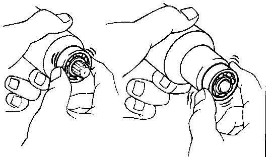 Turn each bearing by hand while applying inward force. If resistance is felt or if the bearing sticks, replace the bearing.