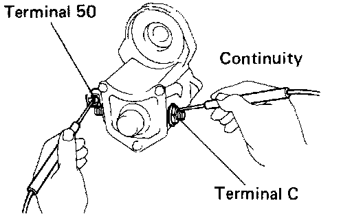 Using an ohmmeter, check that there is continuity between terminals 50 and C. If there is no continuity, replace the magnetic switch assembly.