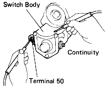 Using an ohmmeter, check that there is continuity between terminal 50 and the switch body. If there is no continuity, replace the magnetic switch assembly.