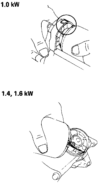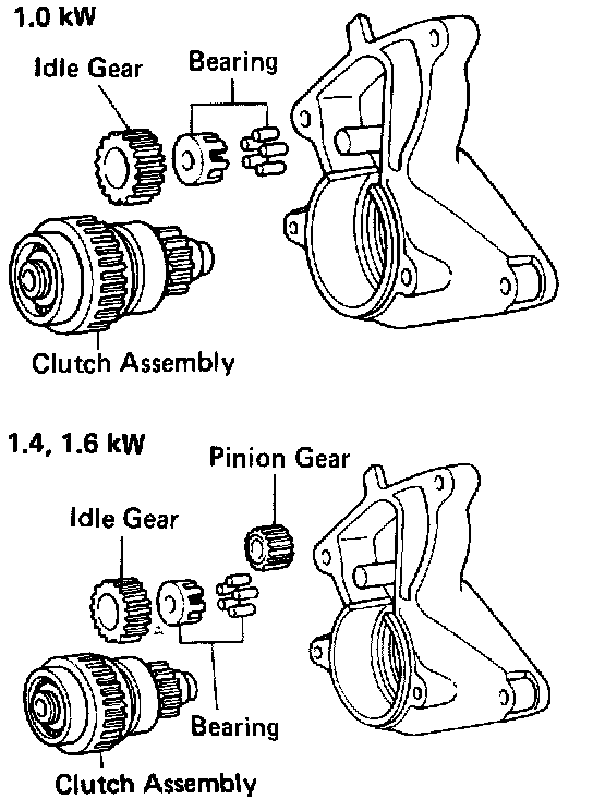 (b) Place the clutch assembly, idler gear, bearing and pinion gear (1.4, 1.6 kw) in the starter housing.