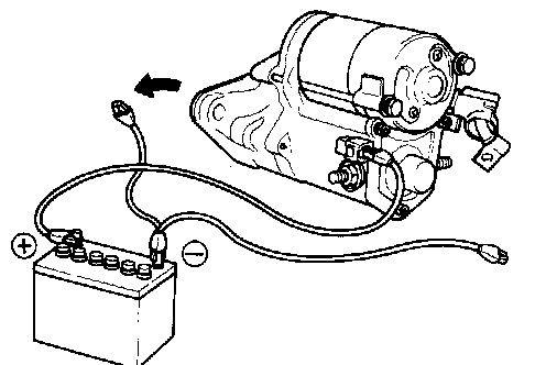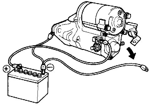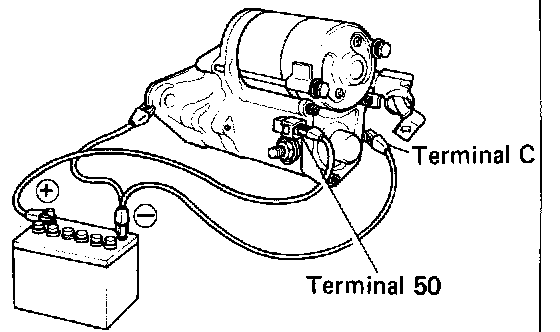 While connected as above with the clutch pinion gear out, disconnect the negative (-) lead from terminal C. Check that the pinion gear remains out. If the clutch pinion gear returns inward, replace the magnetic switch assembly.