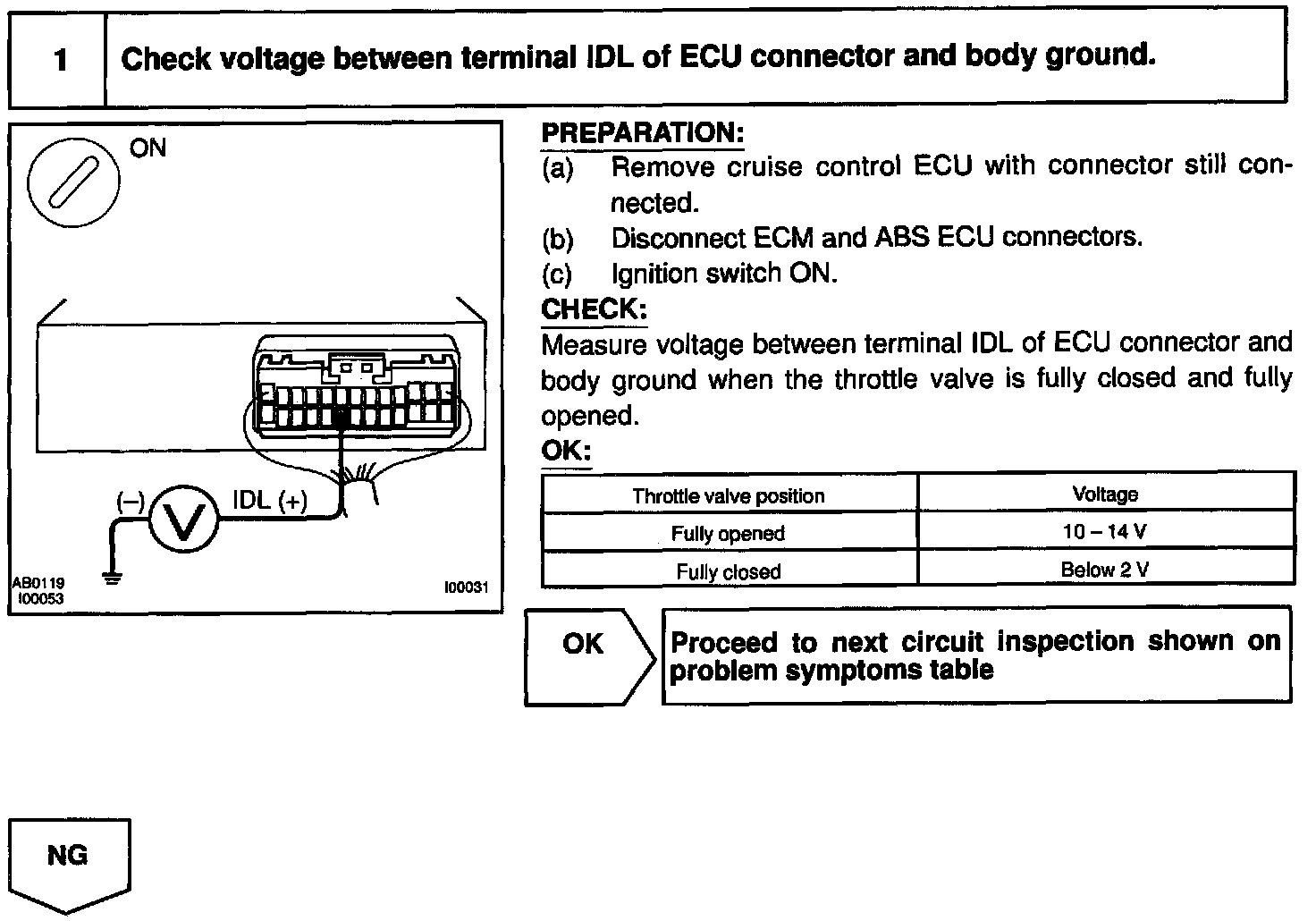 When the idle switch is turned ON, a signal is sent to the ECU. The ECU uses this signal to correct the discrepancy between the throttle valve position and the actuator position sensor valve to enable accurate cruise control at the set speed. If the idle switch is malfunctioning, problem symptoms also occur in the engine, so also inspect engine.