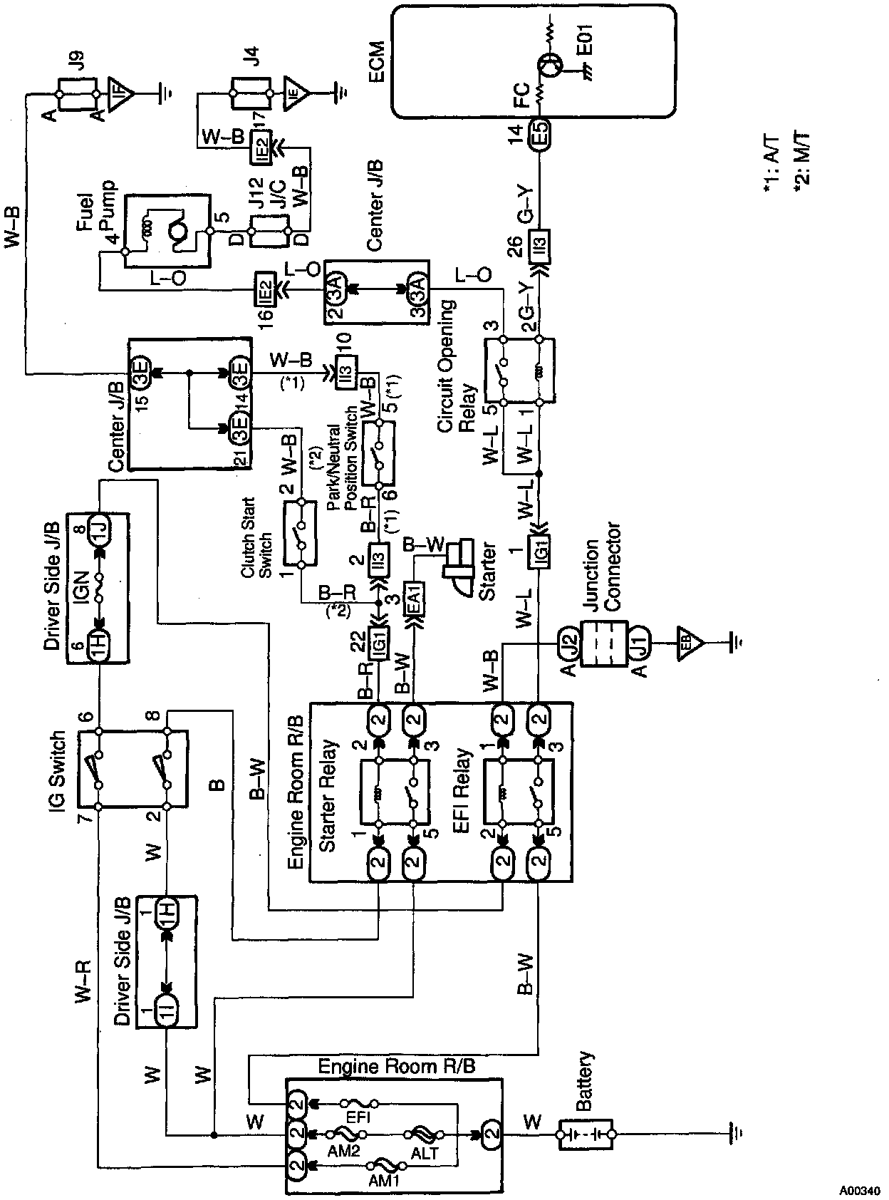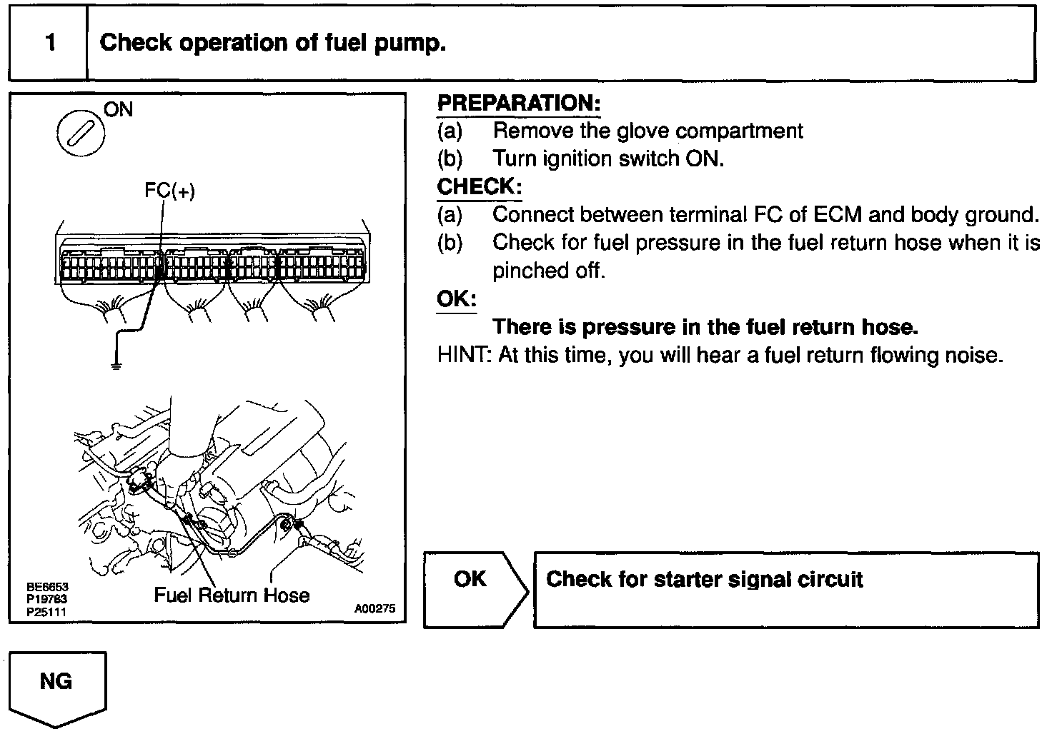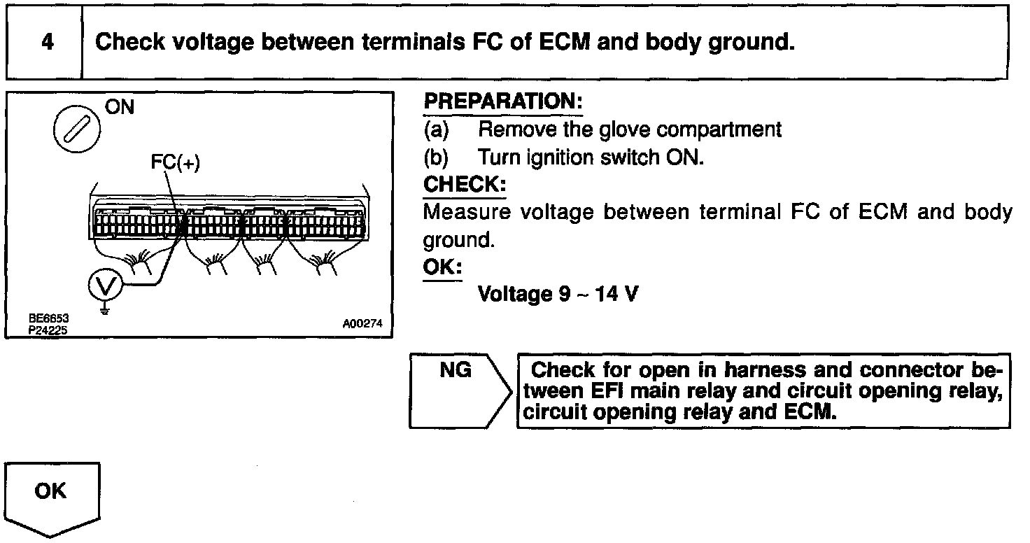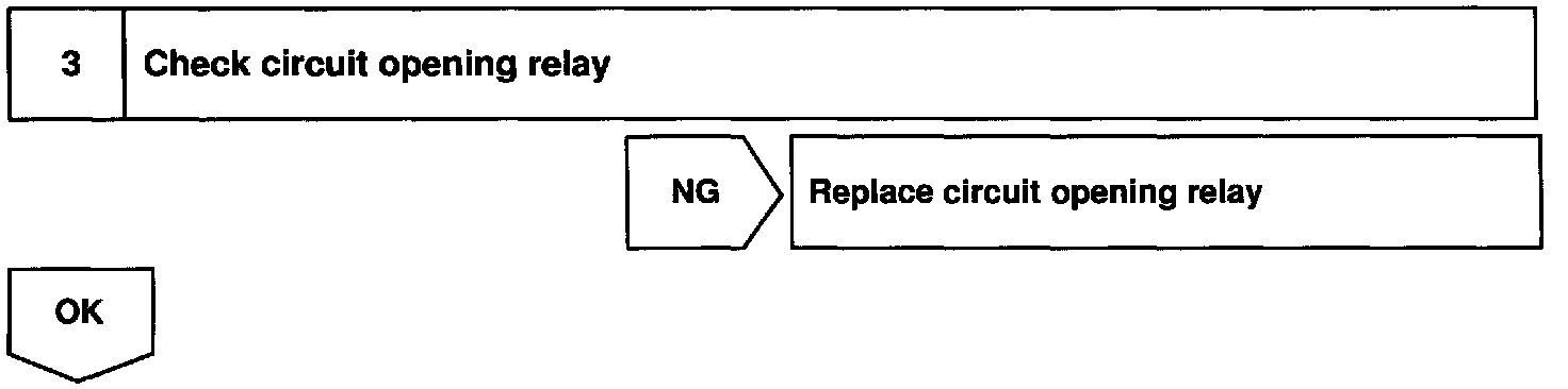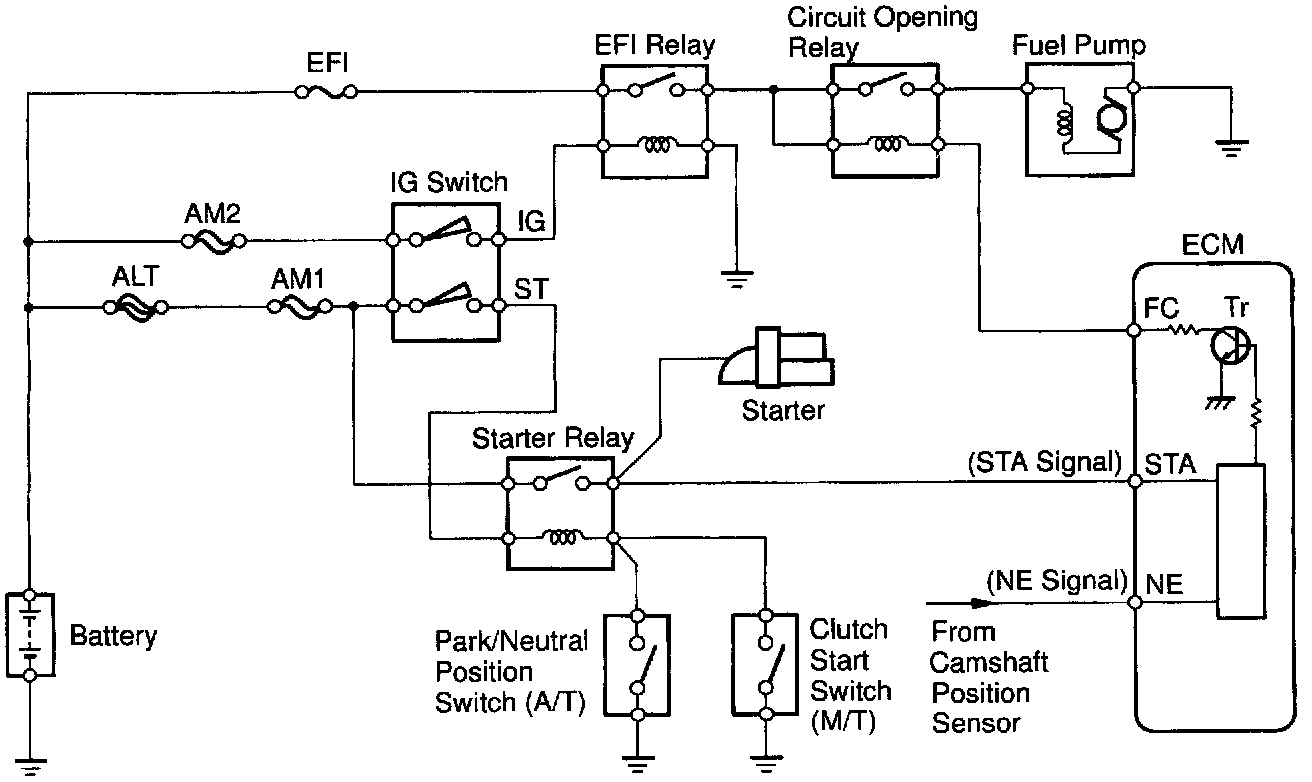 In the diagram above, when the engine is cranked, current flows from terminal ST of the ignition switch to the starter relay coil, the starter relay switches on and current flows to coil L1 of the circuit opening relay. Thus the circuit opening relay switches on, power is supplied to the fuel pump and the fuel pump operates. When the STA signal and NE signal are input to the ECM, Tr is turned ON, current flows to coil L2 of the circuit opening relay, the relay witches on and the fuel pump operates.