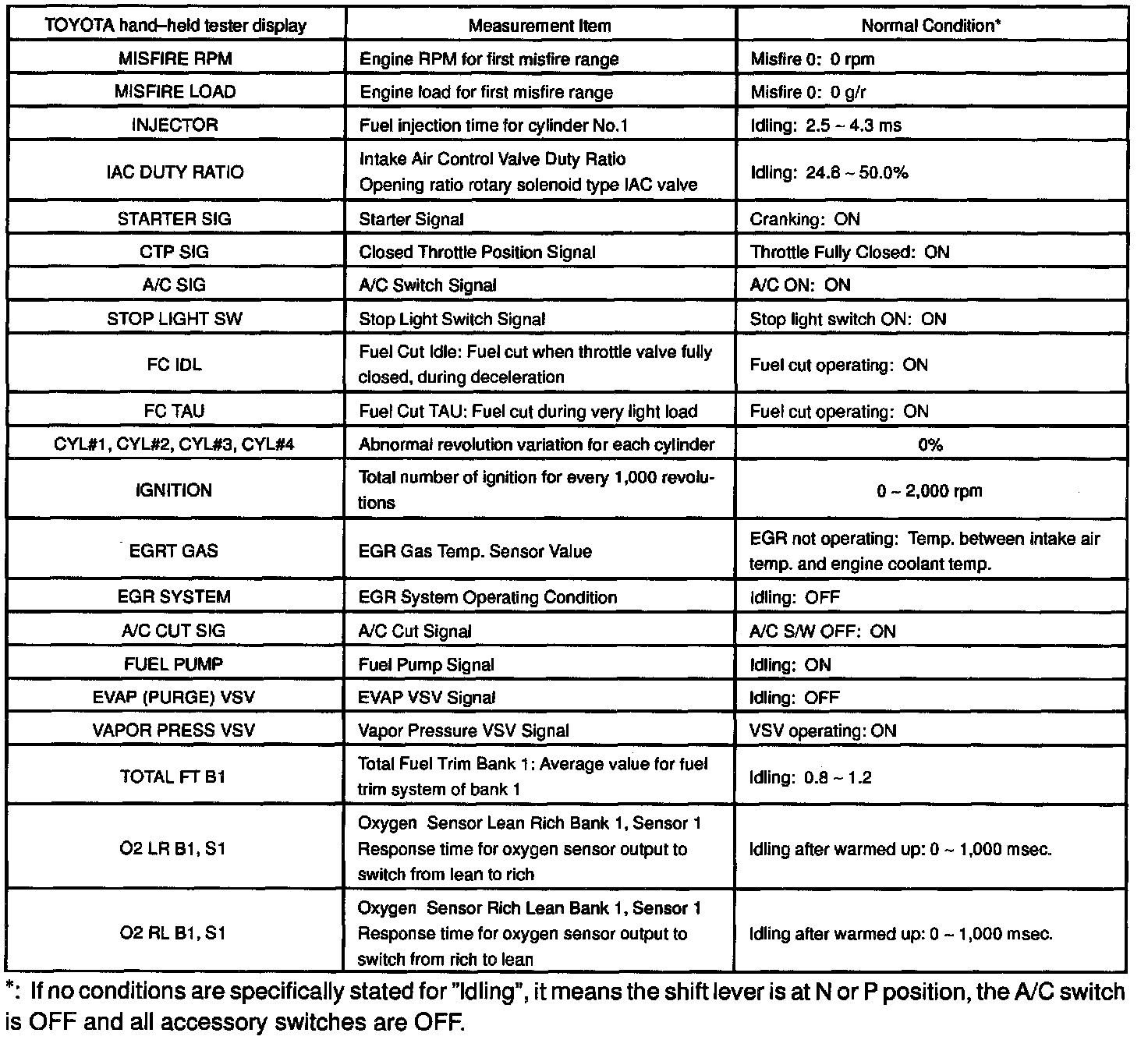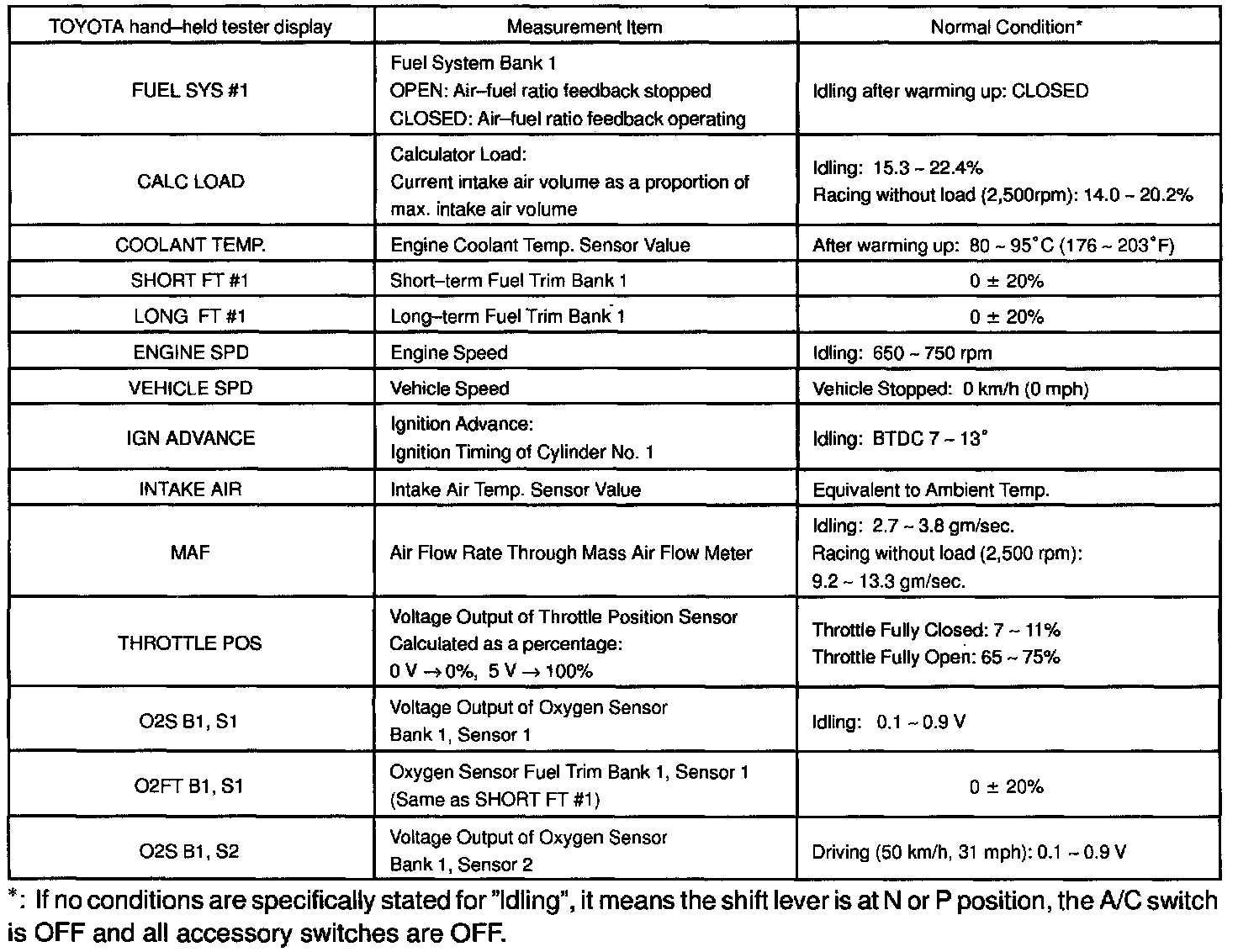 NOTICE: The values given below for "Normal Condition" are representative values, so a vehicle may still be normal even if its value from those listed here. So do not decide whether a part is faulty or not solely according to the "Normal Condition" here.