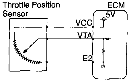 When the throttle valve is fully closed, a voltage of approximately 0.3-0.8V is applied to terminal VTA of the ECM. When the throttle valve is opened. The voltage applied to the terminals VTA of the ECM increases in proportion to the opening angle of the throttle valve and becomes approximately 3.2 - 4.9V when the throttle valve is fully opened. The ECM judges the vehicle driving conditions from these signals input from terminal VTA, uses it as one of the conditions for deciding the air-fuel ratio correction, power increase correction and fuel-cut control etc.