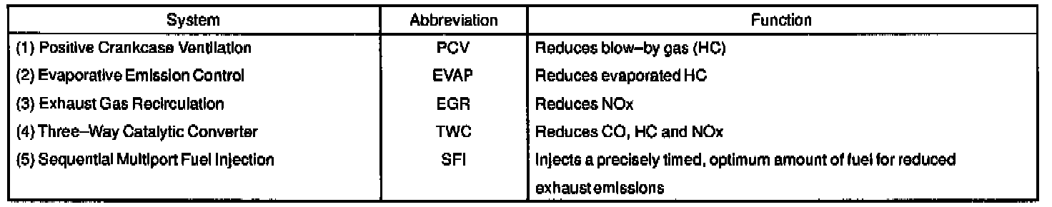 The emission control systems are installed to reduce the amount of CO, HC and NOx exhausted from the engine ((3), (4) and (5)), to prevent the atmospheric release of blow-by gas-containing HC (1) and evaporated fuel containing HC being released from the fuel tank (2).