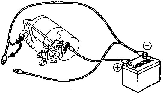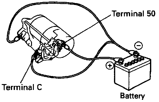 With battery connected as shown with the clutch pinion gear out, disconnect the negative (-) lead from terminal C. Check that the pinion gear remains out.