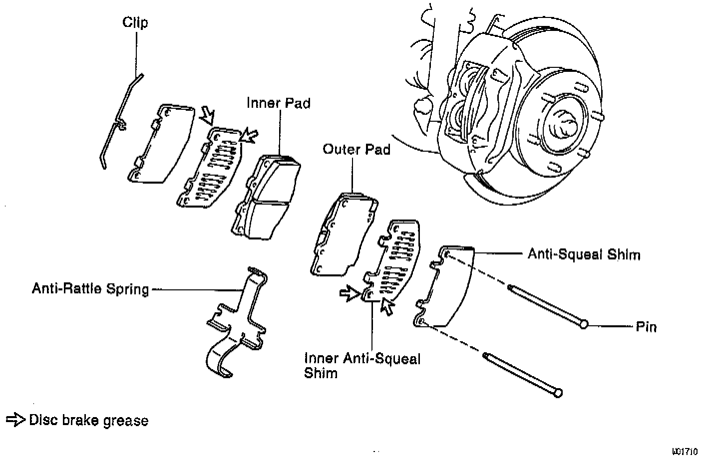 NOTE: Apply disc brake grease to both sides of the inner anti-squeal shims, see EXPLODED VIEW of system.