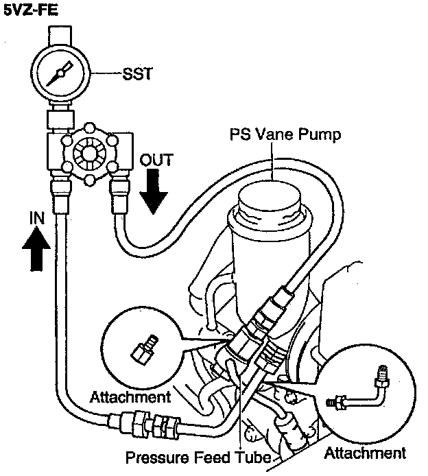 7. With the engine idling, close the valve of the SST and observe the reading on the SST. The minimum fluid pressure is 8,336 kPa (1,029 psi).