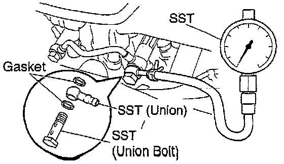 (e) Install SST (pressure gauge) to the delivery pipe with the 2 gaskets and SST (union and union bolt). SST O9268-45012
