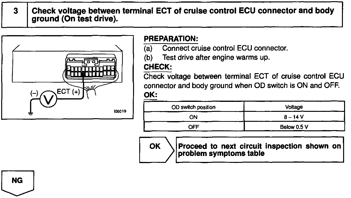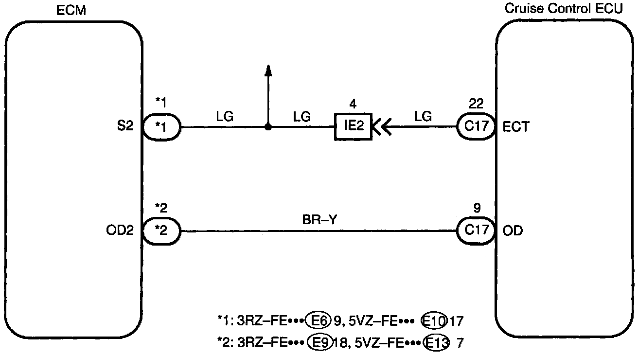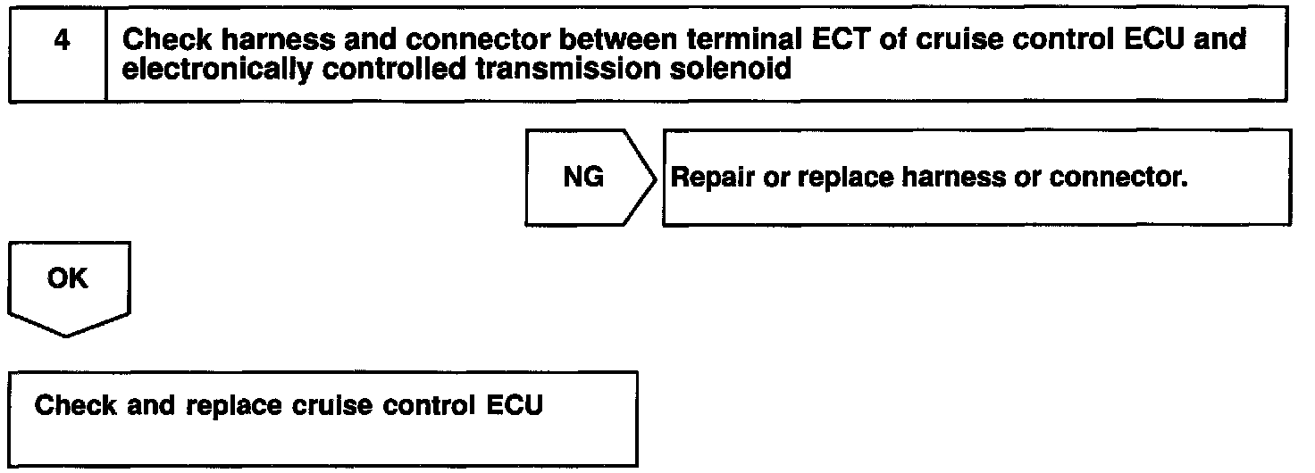 Terminal ECM of the cruise control ECU detects the shift change signal (output to electronically controlled transmission No. 2 solenoid) from the electronically controlled transmission.