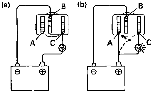 1. Connect the positive (+) lead from the battery to terminal C through a 1.4 W test bulb and the negative (-) lead to terminal B, check that the test bulb does not light up.