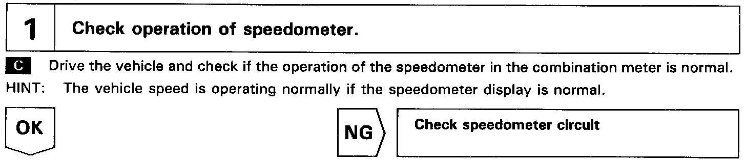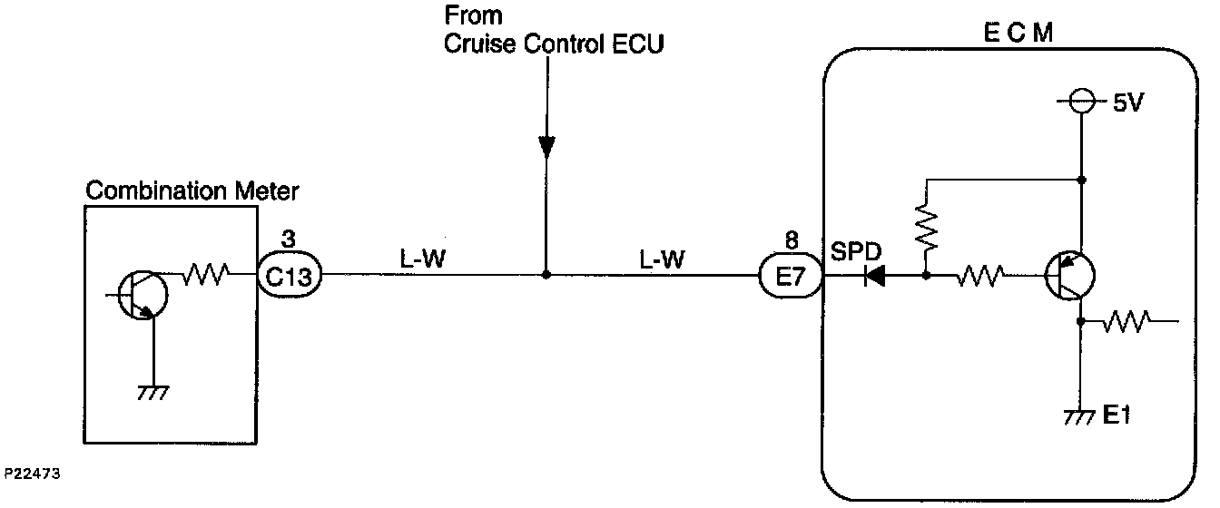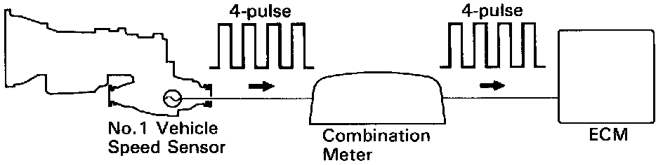 The vehicle speed sensor outputs a pulse signal for every revolution of the rotor shaft, which is rotated by the transmission output shaft via the driven gear. After this signal is converted into a more precise rectangular waveform by the waveform shaping circuit inside the combination meter, it is then transmitted to the ECM. The ECM determines the vehicle speed based on the frequency of these pulse signals.
