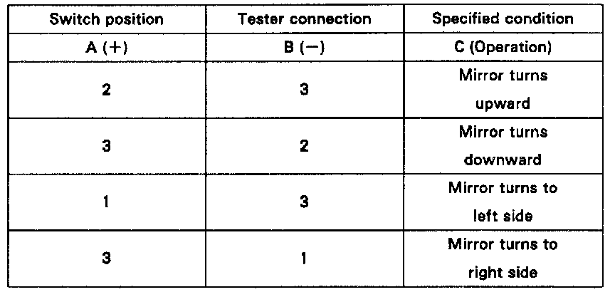 Connect the positive (+) lead from the battery to terminal in column "A" and the negative (-) lead to terminal in column "B", check that the mirror operates in column "C".