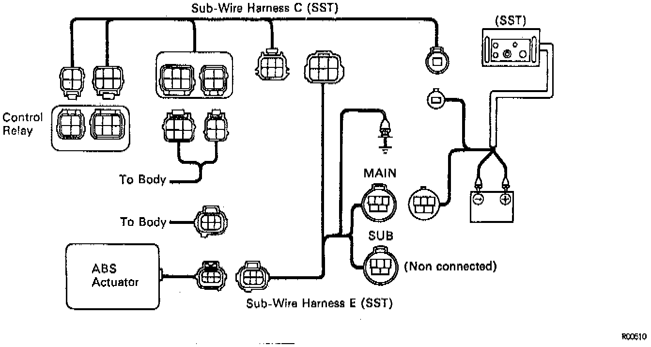 (a) Connect the Actuator checker (SST) to the Actuator, Control Relay and body side wire harnesses via the sub - wire harnesses (SST), as shown.