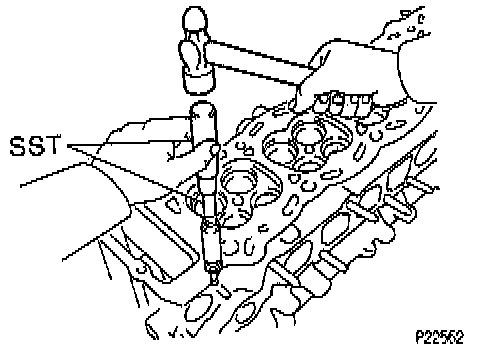 1. Gradually heat the cylinder head to 80° - 100° C (176° - 212° F).2. Using Special Service Tool (SST) Valve Guide Bushing Remover & Replacer Set # 09201 - 10000 (Valve Guide Bushing Remover & Replacer 7 # 09201 - 01070), Handle Set # 09950 - 70010 (Handle 100 # 09951 - 07100) or equivalents and a hammer, tap out the guide bushing.